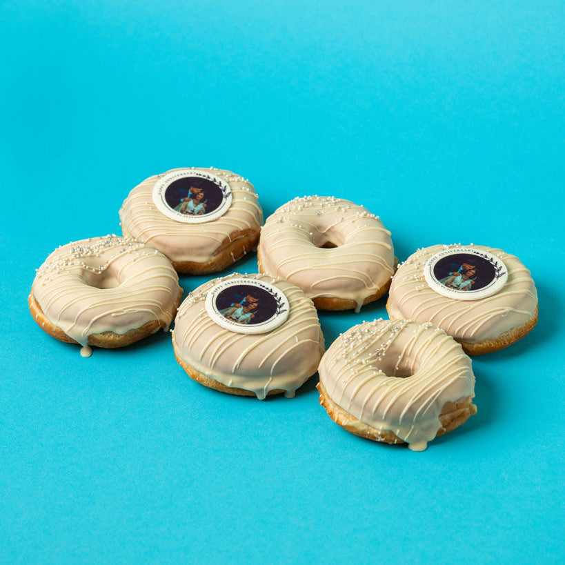 Getaucht in weiße Schokolade, bestreut mit weißen und silbernen Sprinkles, gefüllt mit Vanillecreme, verziert mit essbarem Foto-Topper auf Zuckerfondant.