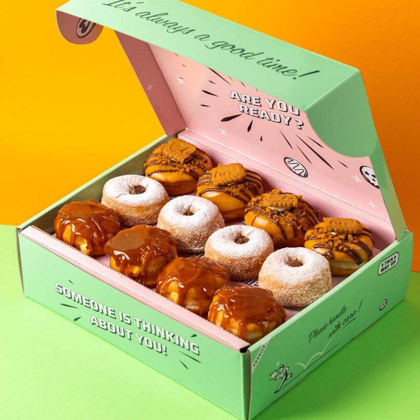 Unsere Doughnuts werden am Versandtag frisch gebacken, von Hand verziert und sorgfältig in unseren Geschenkboxen verpackt. Somit bleiben die Doughnuts bis zu vier Tage frisch und genießbar.